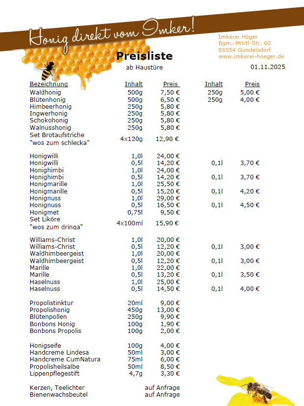 Kontaktiert uns gerne! Name (Pflichtfeld) E-Mail-Adresse (Pflichtfeld) Betreff Nachricht Onlinebestellung Ihr wollt unsere Artikel lieber geliefert bekommen? Kein Problem! Gerne schicken wir euch eure Bestellung zu. Bitte melde Dich über unser Kontaktformular und gib dabei den genauen Artikel, die gewünschte Menge und die Lieferadresse an Wir freuen uns auf Deine Bestellung! Versandkosten kommen noch hinzu und richten sich nach den Tarifen von Hermes. Die Abwicklung erfolgt per Vorkasse (PayPal oder Überweisung). Wir schicken dir nach Erhalt der Bestellung die Rechnung per Mail zu. Imkerei Höger Bgm.-Mörtl.-Str. 60 86554 Gundelsdorf IMKEREI HÖGER ADRESSEBgm.-Mörtl-Str. 6086554 Gundelsdorfihoeger99@web.de LINKSDatenschutzerklärungImpressum